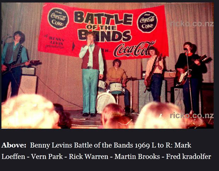 Above: Benny Levins Battle of the Bands 1969 L to R: Mark Loeffen - Vern Park - Rick Warren - Martin Brooks - Fred kradolfer