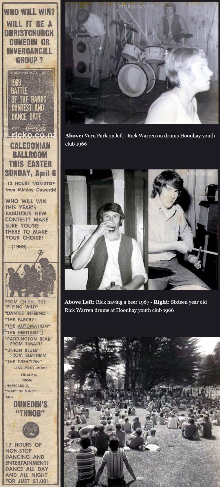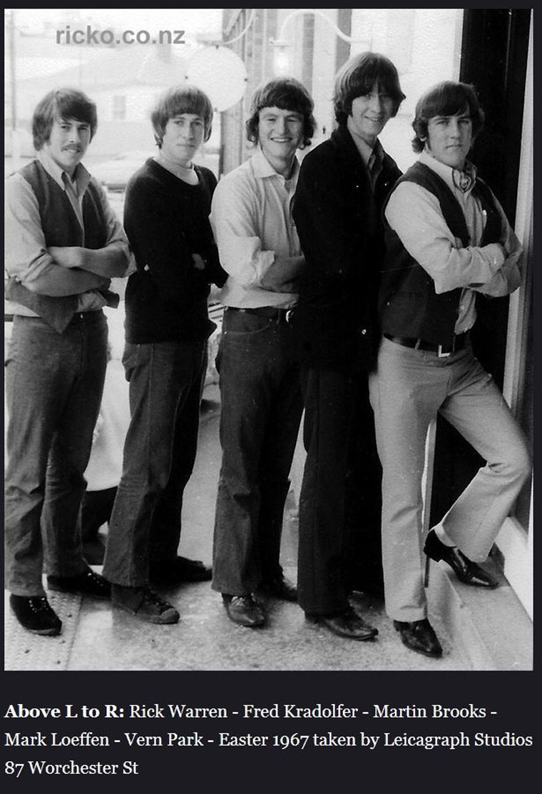 "The Heritage" This band played around Christchurch Youth Clubs mid to Late 1960`s - Started as a 4 piece unit with Vern Park Vocals, Martin Brooks Bass, Mark Loeffen Lead Guitar, Rick Warren Drums - Later Fred Kradolfer came in on rhythm/lead Guitar/Vocals ...(Information and pictures C/- ricko.co.nz NZ Circuit Bands and Musicians)