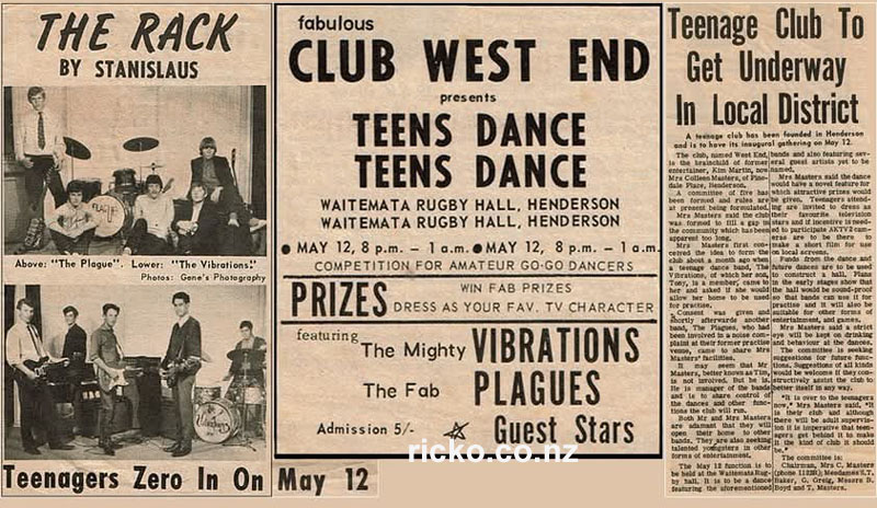 Tony de Jong of the Plague`s Band wrote:The Plague and the Vibrations play for Club West End (1967). Local West Auckland newspaper clippings report on the bands involved and advertise the venue. On one occasion, both bands played (downstairs) in a building on the corner of Great North Road and Trading Place in Henderson. This was where a space had been redecorated to be utilised as a possible future nightclub, but plans to that effect did not eventuate.
